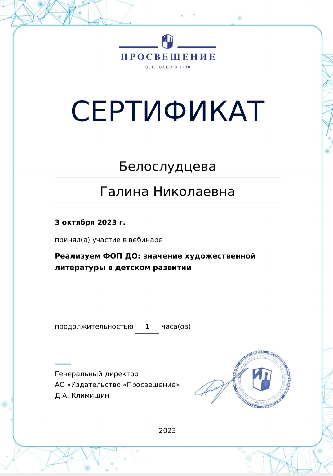 Сертификат участника вебинара «Реализуем ФОП ДО: значение художественной литературы в детском развитии».».